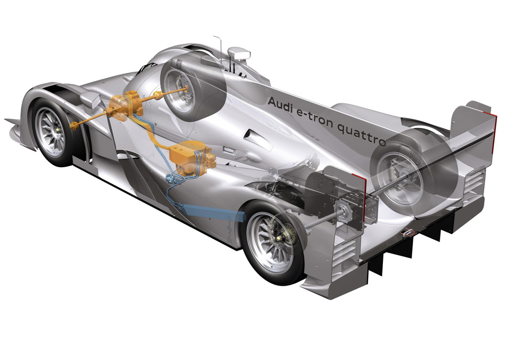 Through the intelligent combination of a conventionally powered rear axle with an electrically powered front axle, the R18 is transformed briefly at regulated points around a circuit into an e-tron quattro – the first Audi race car not to be exclusively powered by an internal combustion engine.