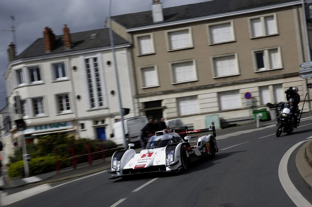 Audi began the 2014 WEC season with a spectacular appearance. The new Audi R18 e-tron quattro did not do its initial kilometres at Le Mans on the legendary race track in Western France but in public traffic. Audi factory driver Tom Kristensen, with nine victories under his belt the record holder of the Le Mans 24 Hours, drove the diesel hybrid sports car from the Saint-Julien du Mans cathedral in the city centre to the famous race track.