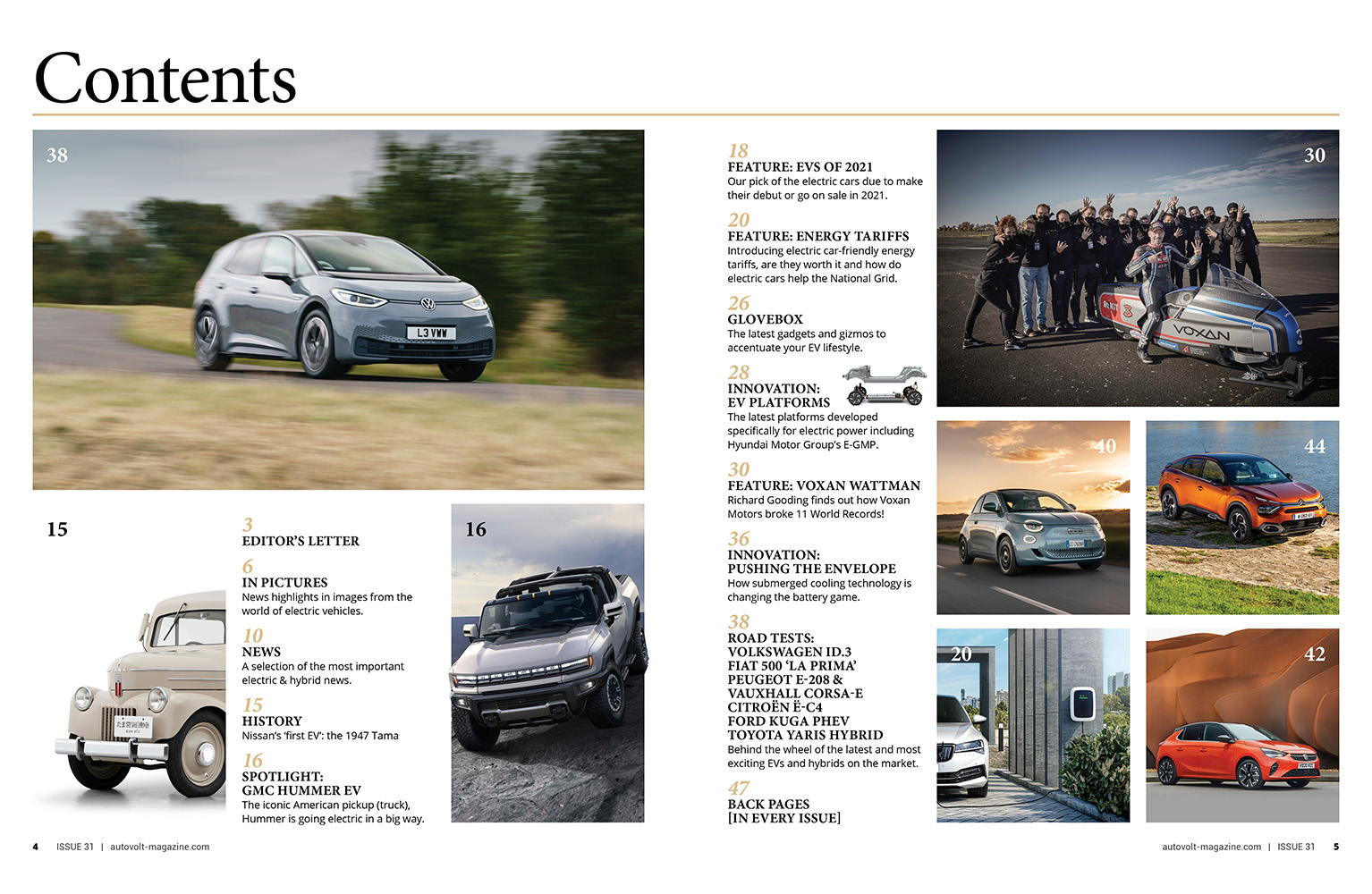 Features include the incredible achievements of Voxan Motors with its Wattman electric motorbike that broke a remarkable 11 records. And we take an introductory look at electric car-friendly energy tariffs. Innovation is coming thick and fast in the world of electrification, and in this issue we cover the submerged battery technology courtesy of Faraday Future and investigate Hyundai Motor Group’s E-GMP platform that’s set to promise 300-mile range and 18-minute charge times.