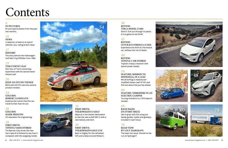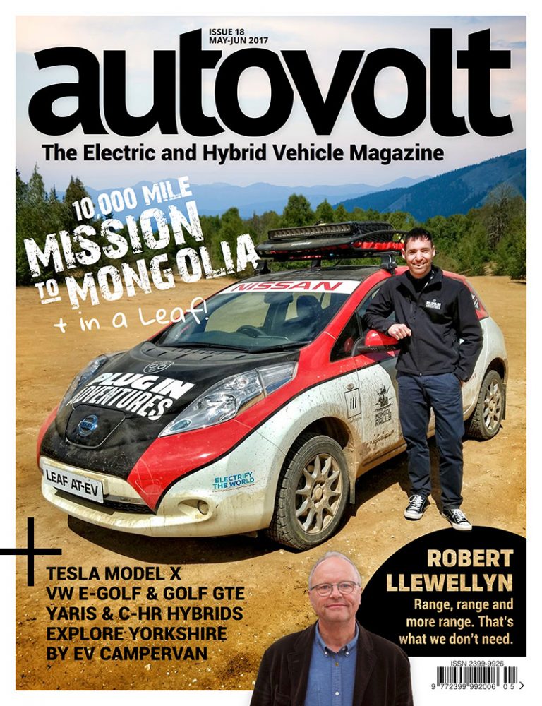 Plug-in Adventurer Chris Ramsey stars on our front cover this issue, and we got to drive his modified Nissan Leaf 30kWh ‘AT-EV’ (All Terrain Electric Vehicle) while getting the lo-down on his forthcoming adventure to Mongolia. There are loads of reviews in this issue, including first drives in the Toyota Yaris Hybrid by Tim Barnes-Clay and Jonathan Musk drives the updated 2017 Volkswagen e-Golf and Golf GTE. Tesla’s Model X SUV 90D is put through its paces, as is the stylish Toyota C-HR Hybrid. In addition, we’ve been exploring Yorkshire in a ’73 VW Camper that has been converted to electric power, courtesy eDub Trips. Regular columnist Robert Llewellyn wonders whether electric cars already have too much range and Mark Preston discusses the importance of teaching engineering in schools. Is your car safe? We do a hands-on review of Arlo Pro and Blink security cameras. There’s all this plus, as always, much more inside. Get the magazine from Readly, Magzter and MagCloud.