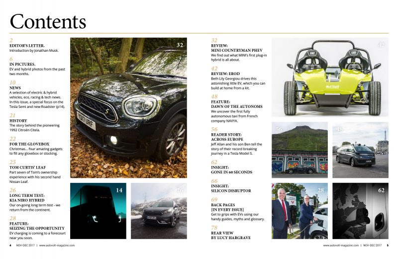 We drive the a car that’s been a long time coming ever since the first MINI E trials of 2009-10, the MINI Countryman PHEV – the brands first foray into plug-in power. Beth Lily Georgiou gets to grips with the wonderfully minimal Swiss-built electric ‘erod’, which interestingly can also be ordered in kit form. Robin Whitlock talks to InstaVolt about providing free rapid chargers to fuel forecourts. Autovolt uncovers the latest NAVYA autonomous vehicle – a fully autonomous taxi that should be in a city near you, as soon as mid-2018. We’ve a special news focus on the latest Tesla reveal – a double whammy of Semi truck and new Roadster. The stats are mind-blowing. Furthermore, we’ve our latest Kia Niro long term review update. Additionally, Robert Rango and Ben Park provide insight into the next-generation of battery technology and what it might mean for EVs once ultra-fast charging arrives. Plus, as always, there’s more electric and hybrid news inside.