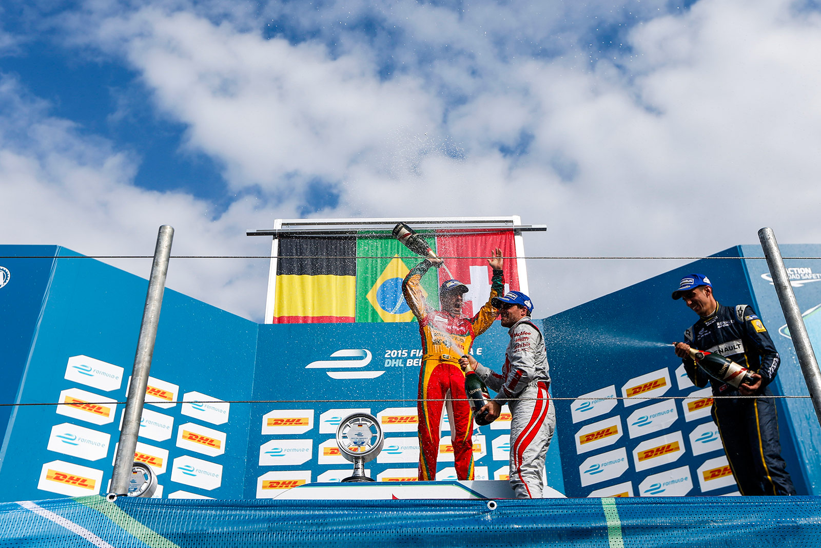 Formula E Lucas di Grassi (Audi Sport ABT) celebrates his victory at the DHL Berlin ePrix - before the decision to exclude him from the race due to front wing modifications found in post-race scrutineering