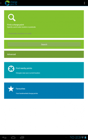 Charge Your Car – Welcome screen showing advanced button and favourites link