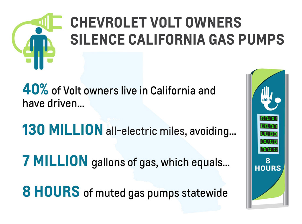 Electric vehicles, well known for silent driving, also are muting the ding of petrol pumps. In less than three years, Chevrolet Volt owners in California have driven more than 130 million all-electric miles, avoiding use of an estimated 7 million gallons of petrol – enough to mute petrol pumps across the state for nearly eight hours. Naturally, with the inclusion of the UK’s Vauxhall Ampera and Europes Opel equivalents to the Chevrolet Volt, the true figure would be much higher.