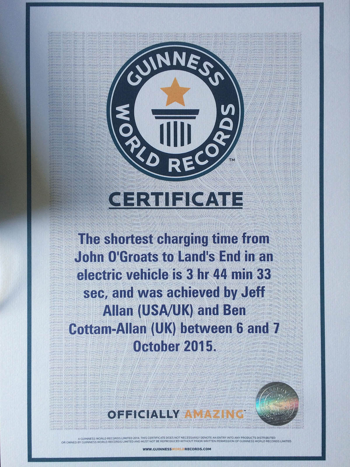The first record for an Electric car to travel from Land’s End to John O’Groats was set in 2011 by David Peilow and Kevin Sharpe in a Tesla Roadster. They completed the journey over a period of two days, as the charging infrastructure was not as abundant as it is today. Jeff and Ben did it in less than half the time, stopping just six times to charge the car. They had to submit evidence to Guinness World Records including a digital record, witness signatures and an analysis by two independent experts to win the award.