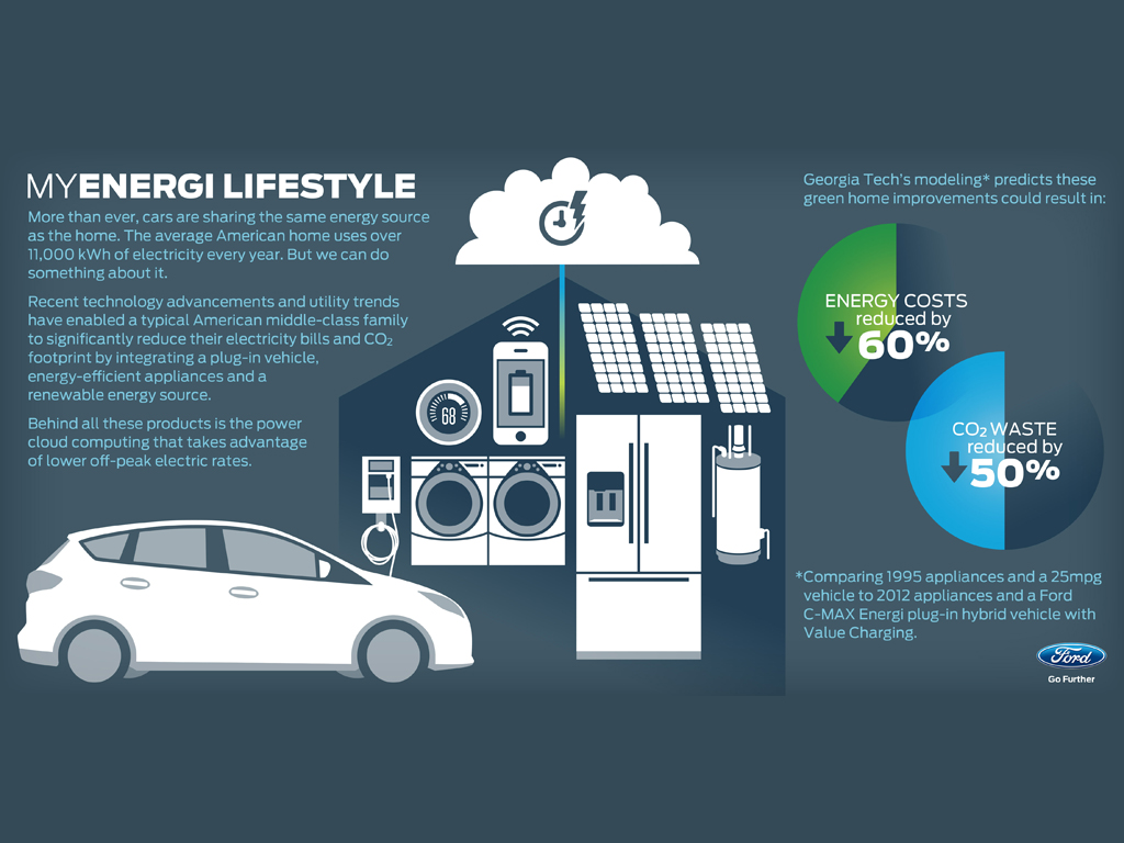 Ford collaborated with companies, Eaton, Infineon, SunPower and Whirlpool to create MyEnergi Lifestyle. They retrofitted two family homes with energy efficient appliances and solar panels as well as providing the families with Ford C-MAX Energi plug-in hybrid (PHEV) vehicles.