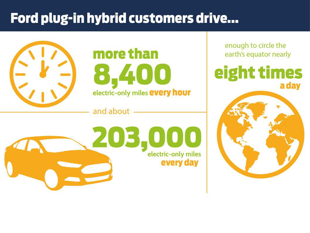 Data show Ford plug-in hybrids are being driven about 203,000 electric miles every day and more than 8,400 miles every hour. The aggregate data are collected through MyFord Mobile, available on Ford’s plug-in vehicles, Fusion Energi and C-MAX Energi, and Focus Electric.