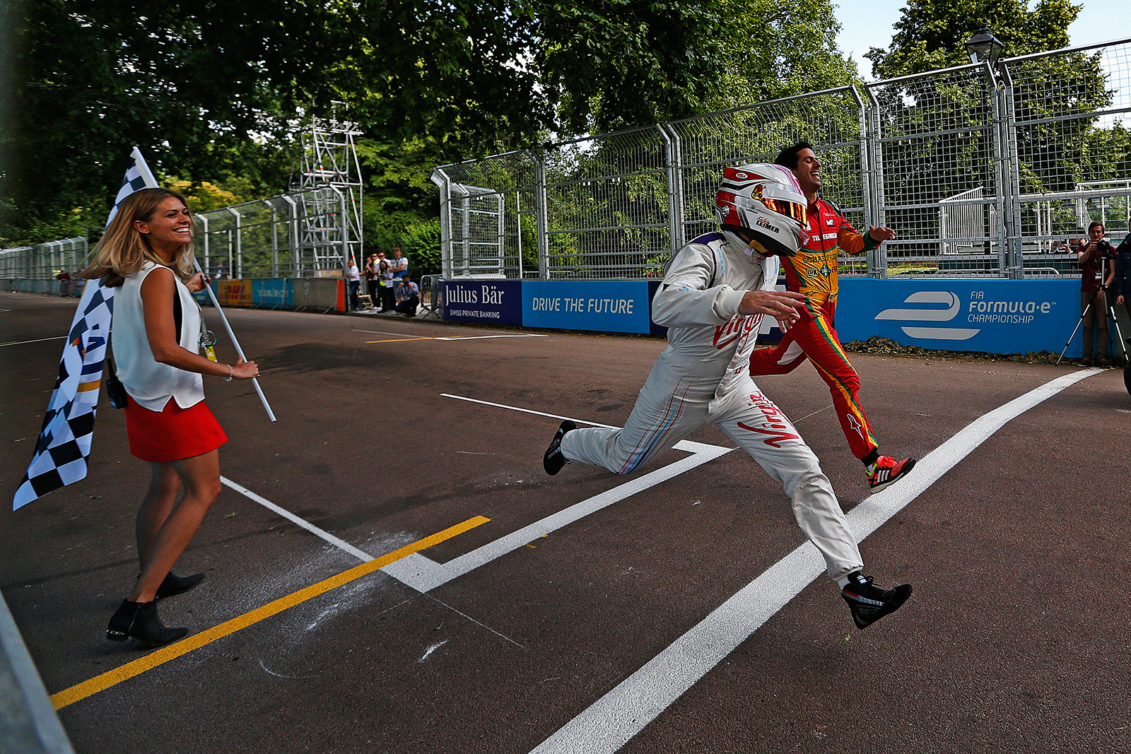Alongside Boris’ blast in the electric race car, drivers held a 100m sprint after athlete Usain Bolt challenged them, pictures follow.