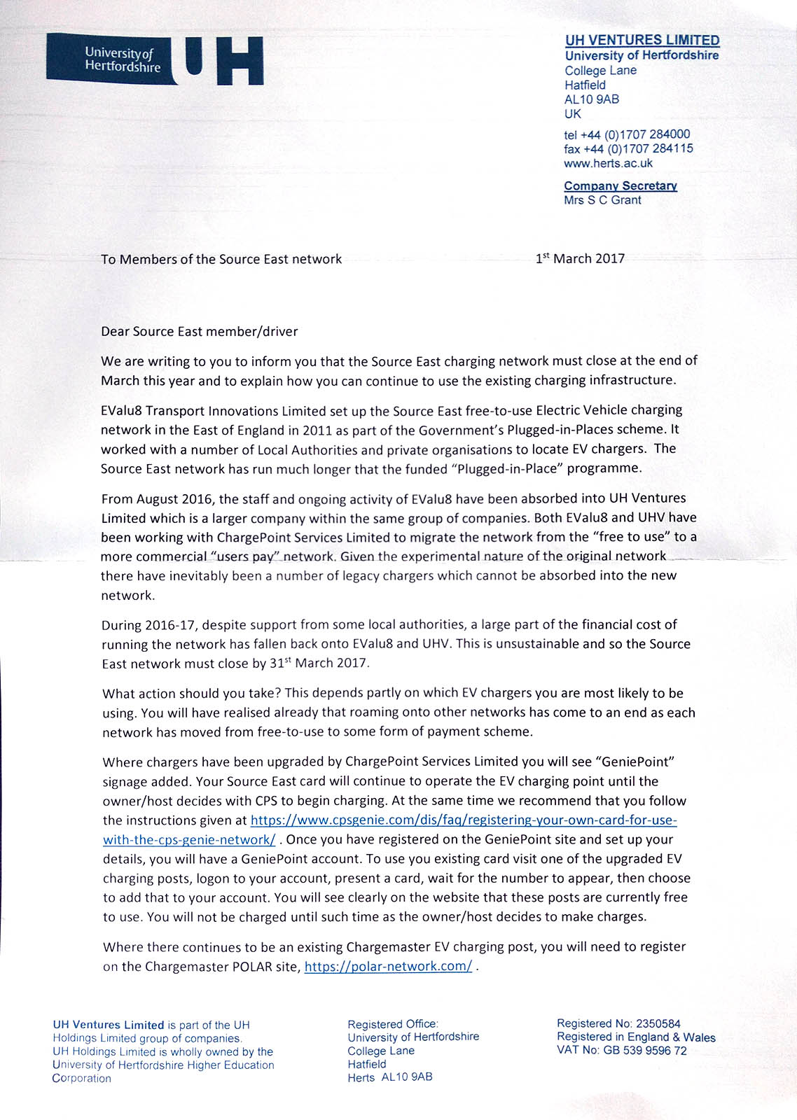The existing charge points will return to their owners, with other being transferred to other networks. FOr the end user, this means signing up to different networks in order to continue to use Source East charge points. For example, the charge points in St Albans mostly belong to Chargemaster and so those will require a Polar membership to operate them.
