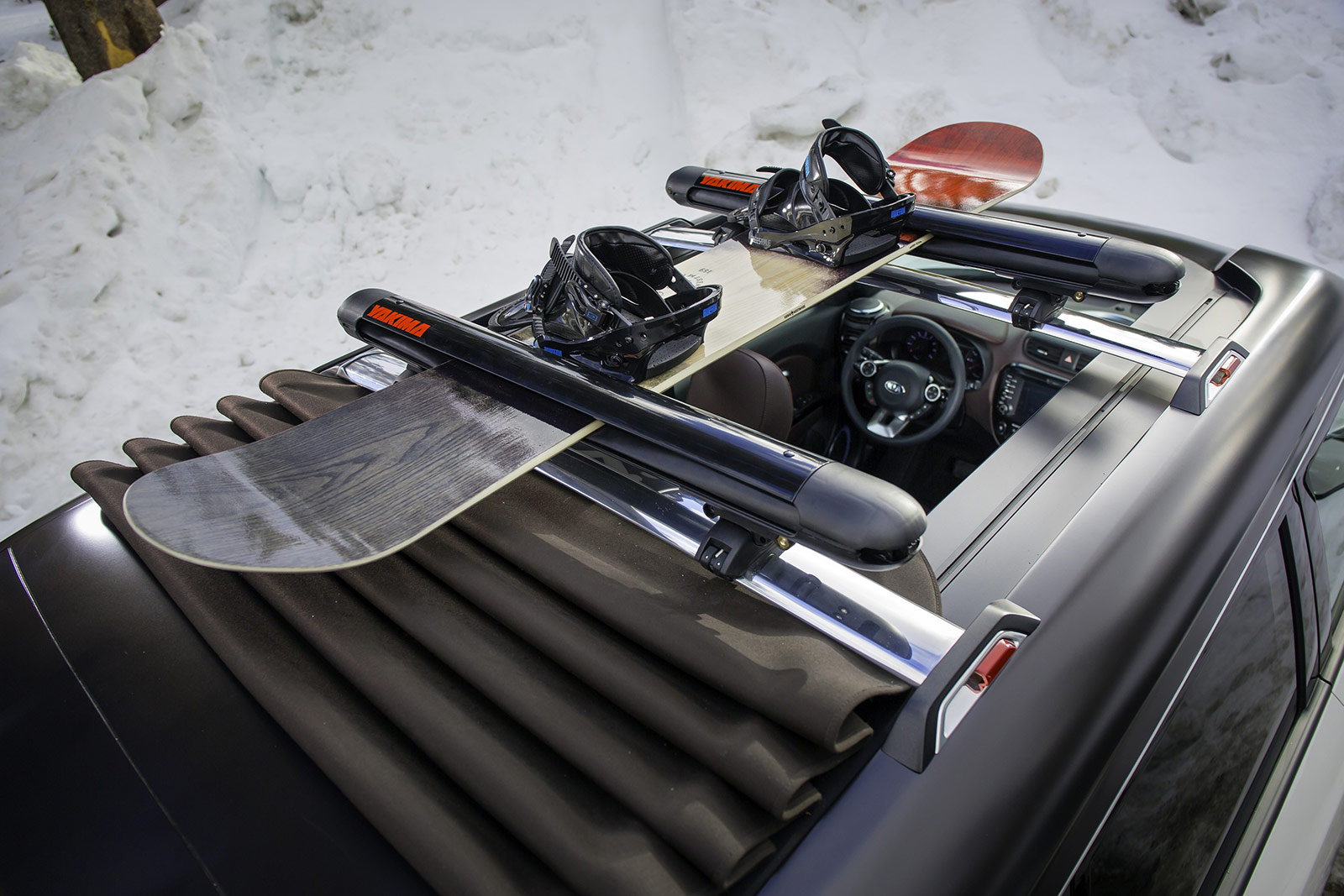 For traversing tough terrain, the Trail’ster has been raised more than two-and-a-half inches over the production Soul. In addition, this mountain rover wears Pirelli Winter Carving 245/45-19 snow tires for enhanced traction and utilises KSport coilover shocks to absorb the impact of rough, uneven ground and rocky surfaces.