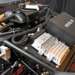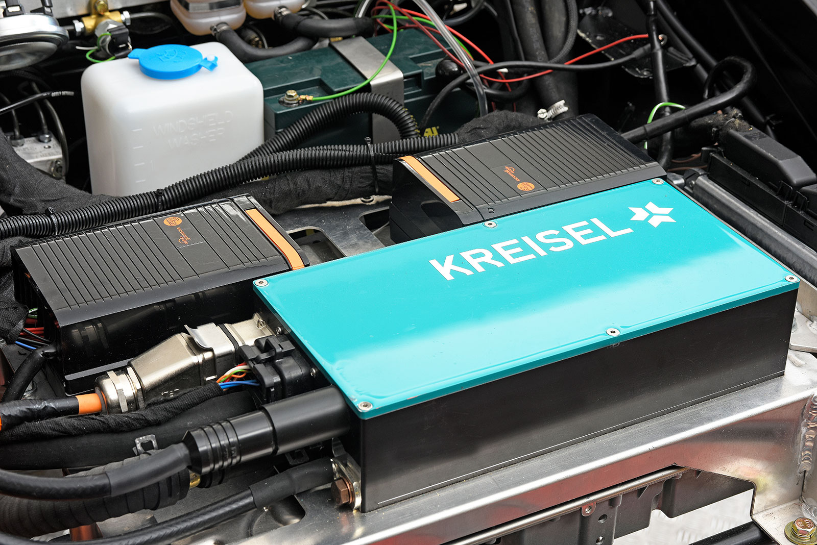 The high-performance (lithium-ion) battery pack, with 53 kilowatt-hour capacity, which is installed in the Kreisel EVEX 910e, weighs 1,100 kilograms and enables a realistic range of 350 kilometres (217 miles). To accommodate the battery system as well as the powertrain in the rear, the frame of the original vehicle has been slightly modified. Besides that the air-cooling of the historical vehicle was replaced by a cooling system which Kreisel developed for the high-performance drivetrain.