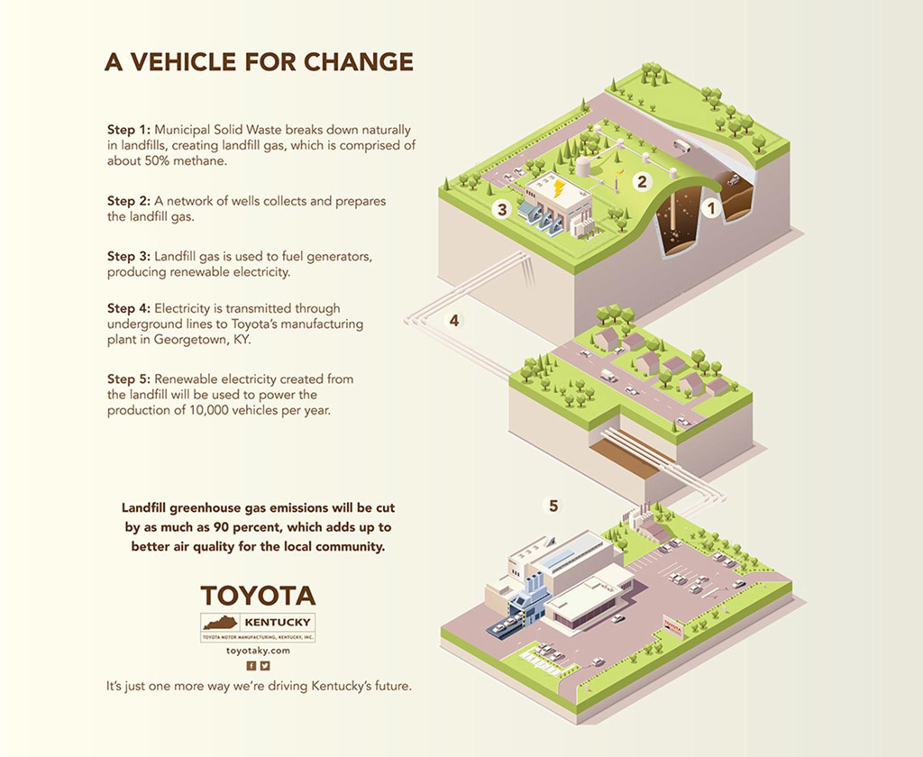 Toyota is working with Waste Services of the Bluegrass to collect the gas, which is created as the solid landfill waste breaks down. It is captured in a network of wells and used to fuel electricity generators. The power is then fed by underground lines to the Toyota plant a few miles away.