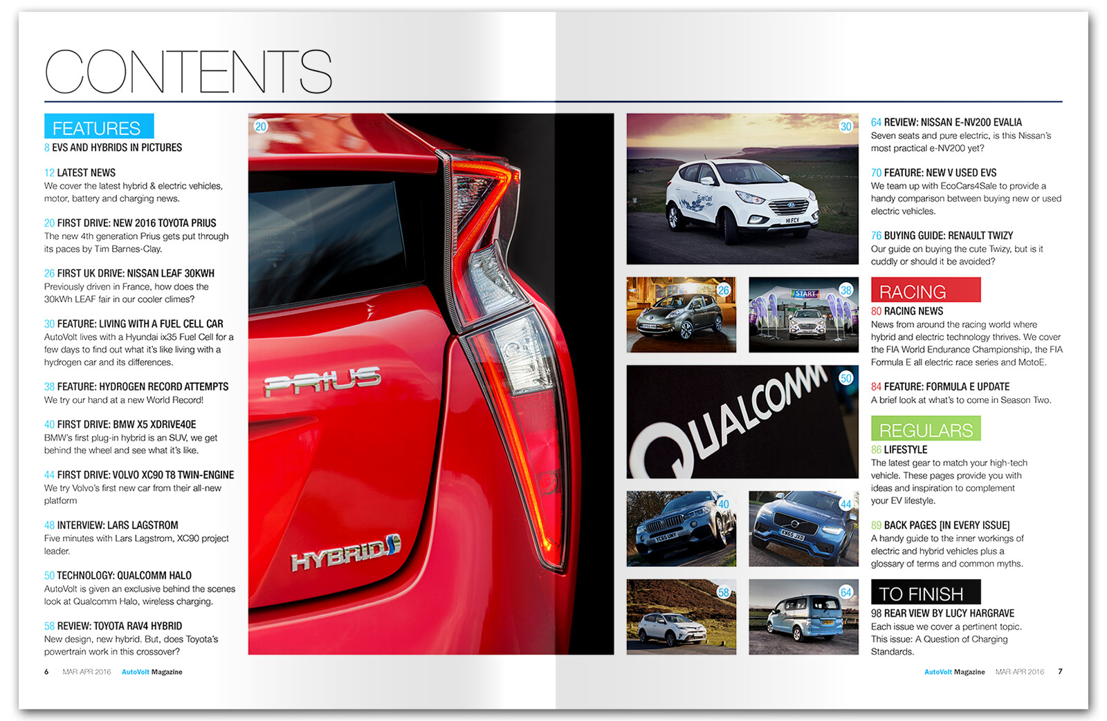 Our man Tim Barnes-Clay gets to grips with the new 2016 Toyota Prius for a first drive in Spain, while back in the UK we get to test the Nissan LEAF 30kWh for the first time. You may have noticed there are ever more SUV and crossover vehicles on our roads and there’s plenty of reasons both for and against them. Nonetheless, manufacturers have noticed they’re selling well and that they also offer car makers a chance to stuff them full of hybrid tech too, thanks to there being more space. In our latest issue, we do a full review of the Toyota Rav4 Hybrid & Nissan e-NV200 Evalia (7-seater), a first drive of the BMW X5 xDrive40e and Volvo XC90 T8 Twin-Engine plus of course the Hyundai ix35 Fuel Cell is also a crossover vehicle!