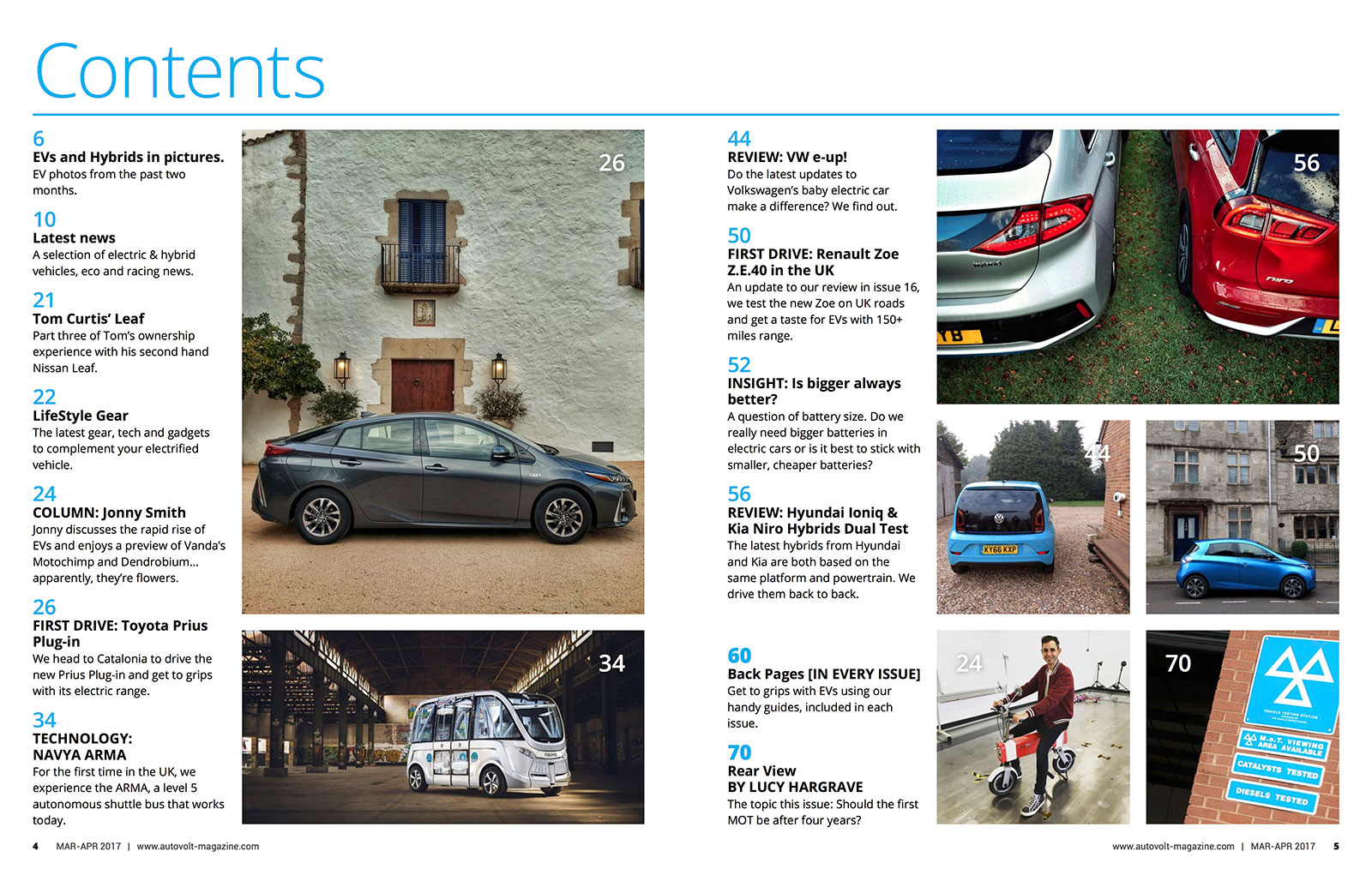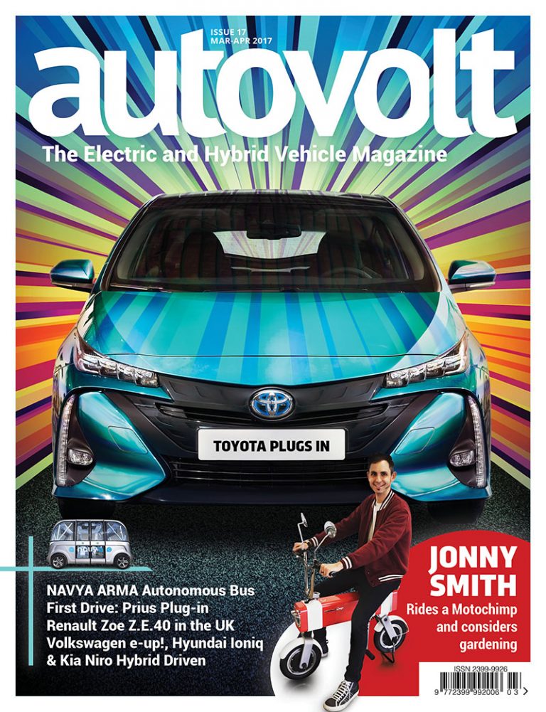 We head to the Costa Brava to experience the economical new Toyota Prius Plug-in. VW’s recently refreshed e-up! electric city car is put through its paces and we try the Renault Zoe Z.E.40 on UK soil for the first time. We’ve a pair of hybrids on test too, the sleek Hyundai Ioniq Hybrid and its related sister, the Kia Niro Hybrid. Jonny Smith is this issue’s columnist who has a go on a Motochimp electric scooter and considers the maker’s gardening expertise. Autovolt travels on the impressive NAVYA ARMA autonomous shuttle bus, during its first UK demonstration. Plus, we focus on the electric and hybrid highlights from this year’s Geneva Motor Show. We’ve added a new feature too, looking at an historic EV; this issue, it’s the turn of the Toyota IQ EV. As always there’s much more to look forward to.