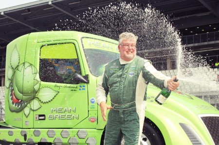 ‘Mean Green’ driver, Boije Ovebrink celebrates his win in the customary manner