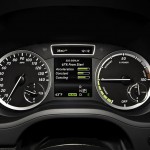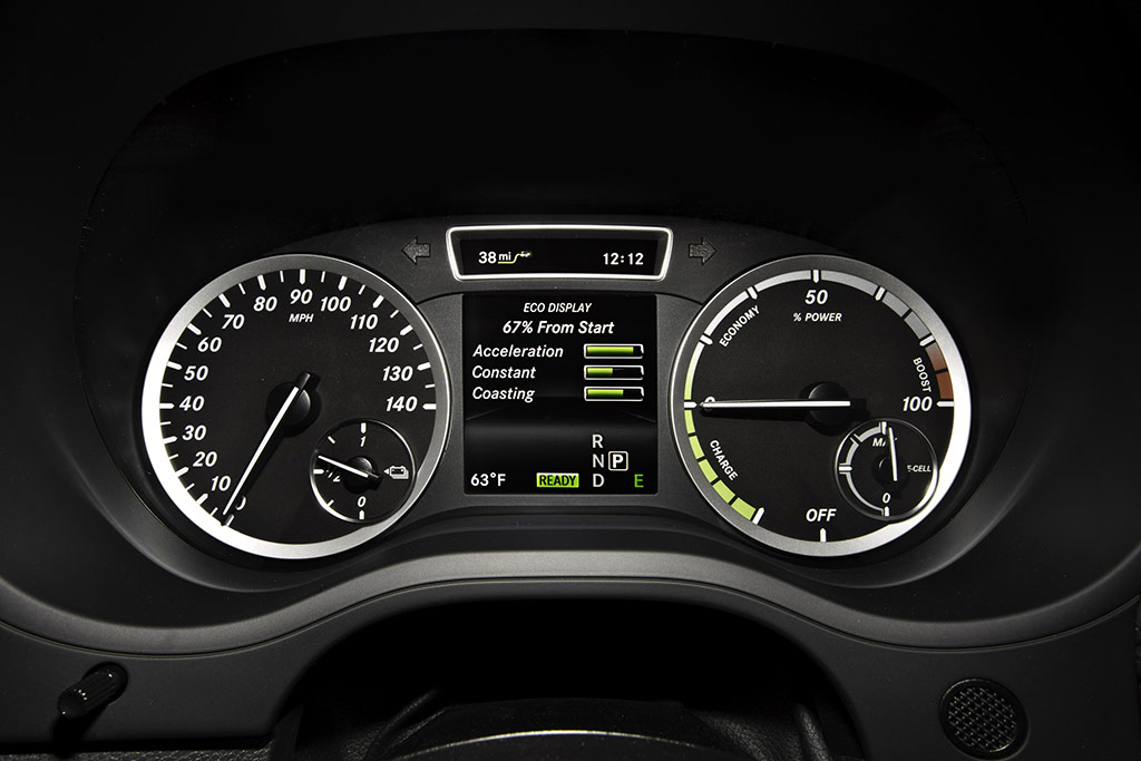 The instrumentation of the B-Class Electric Drive is rounded off by functions that are specific to electric vehicles. One of the striking features is the power display in the right-hand circular instrument. The instrument pointer moves in a clockwise direction from the green zone towards the red zone, when full power is demanded by the driver. It drops back below the zero line when the vehicle is feeding energy into the battery through the recuperation feature.