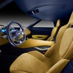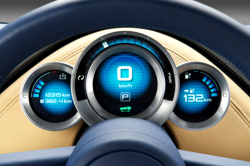 The seats themselves are upholstered in gold leather and perforated gold suede while the doors are trimmed in dark blue leather and suede. The blue and gold motif, the colour of sparks, is continued across the dashboard, which is also adorned with silver carbon trim, and features four multifunction illuminated LCD displays.