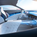 The front windscreen serves as a transparent display: driving-related data and geographical information is shown across its full width, augmenting the outside world with additional information. This information can be controlled and adjusted by the occupants using gestures.