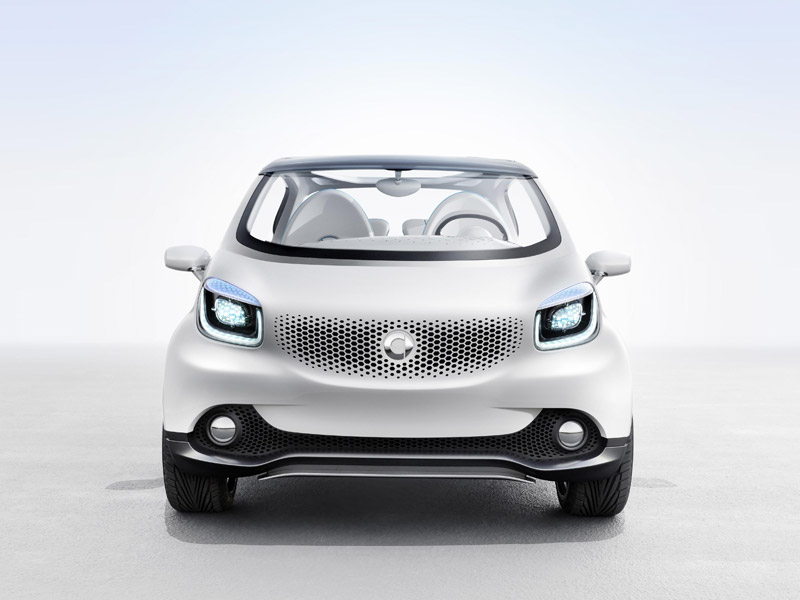 The study shows that smart is becoming more grown-up. The deliberately three-dimensional, upright front gives it a very expressive appearance that greets the viewer with a fresh smile that is both friendly and assertive. The smart fourjoy proudly displays the large brand emblem on the front grille.The honeycomb structure of the air inlets on the front and the convex and sensuously shaped body surfaces emphasise the family relationship to the studies smart for-us (Detroit 2012) and smart forstars (Paris 2012).