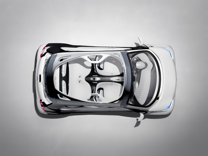 Without doors, a rear window or roof panel the smart fourjoy really brings the city inside. Elements that connect the exterior and the interior are the handles for driver and passenger on the side sills and the openings in the roof structure.