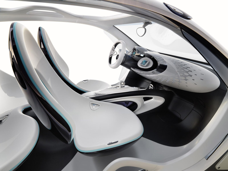 The design of the spherical instrument cluster and the single-spoke steering wheel are reminiscent of the original smart. Two smartphones are mounted on the dashboard and on the centre tunnel at the rear for cutting-edge connectivity and tailor-made entertainment for all four passengers.