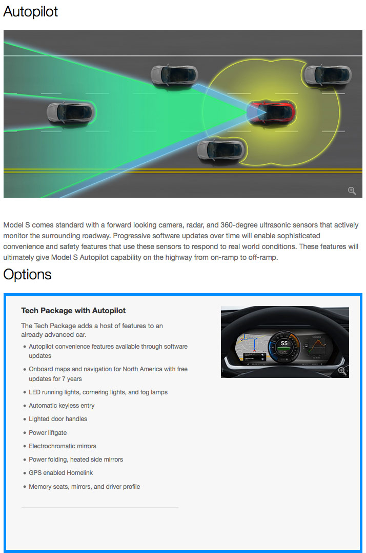 Tesla haven’t just made the singular announcement concerning their all wheel drive option as they have been busy rectifying one of Model S’ early criticisms regarding its relative lack of technology for automated driving aids. Dubbed, “Autopilot” the new optional system introduces a forward looking camera, radar and 360 degree ultrasonic sensors which actively monitor the road ahead. The system is similar to that which you might find in rival offerings from the likes of Infiniti and essentially combines lane following with collision awareness as well as distance control, meaning for long motorway trips particularly, driving is all but automated.