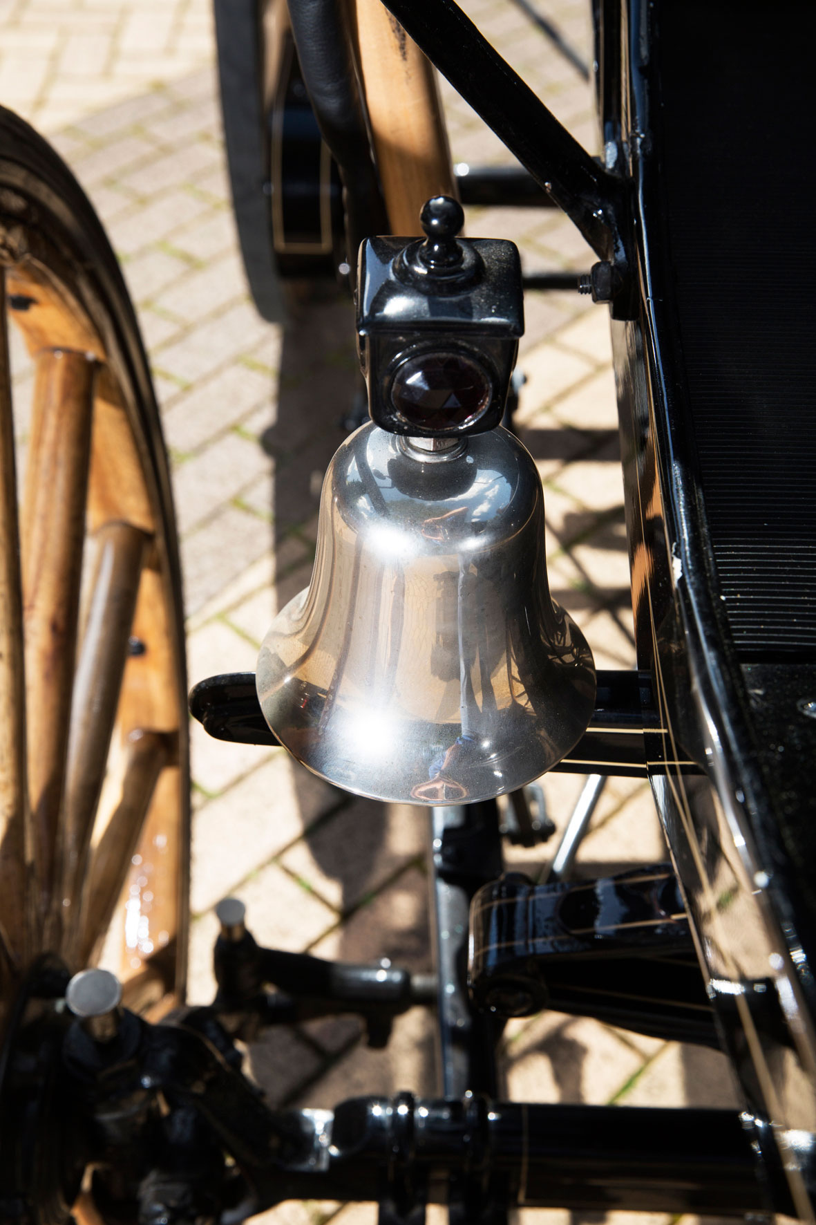 The very compact 1907 Victor High Wheel Runabout, built one year later in Indianapolis, spent many years on display in an American Museum before being imported to the UK, when it was the subject of a complete sympathetic overhaul. This included the fitment of contemporary batteries and charging system, and a recent repaint of both the chassis and bodywork, together with black leather upholstery and far from rudimentary patent leather mudguards to protect its inhabitants. As is the case of the Pope Waverley, vision is superb from the high driving position.