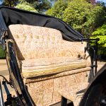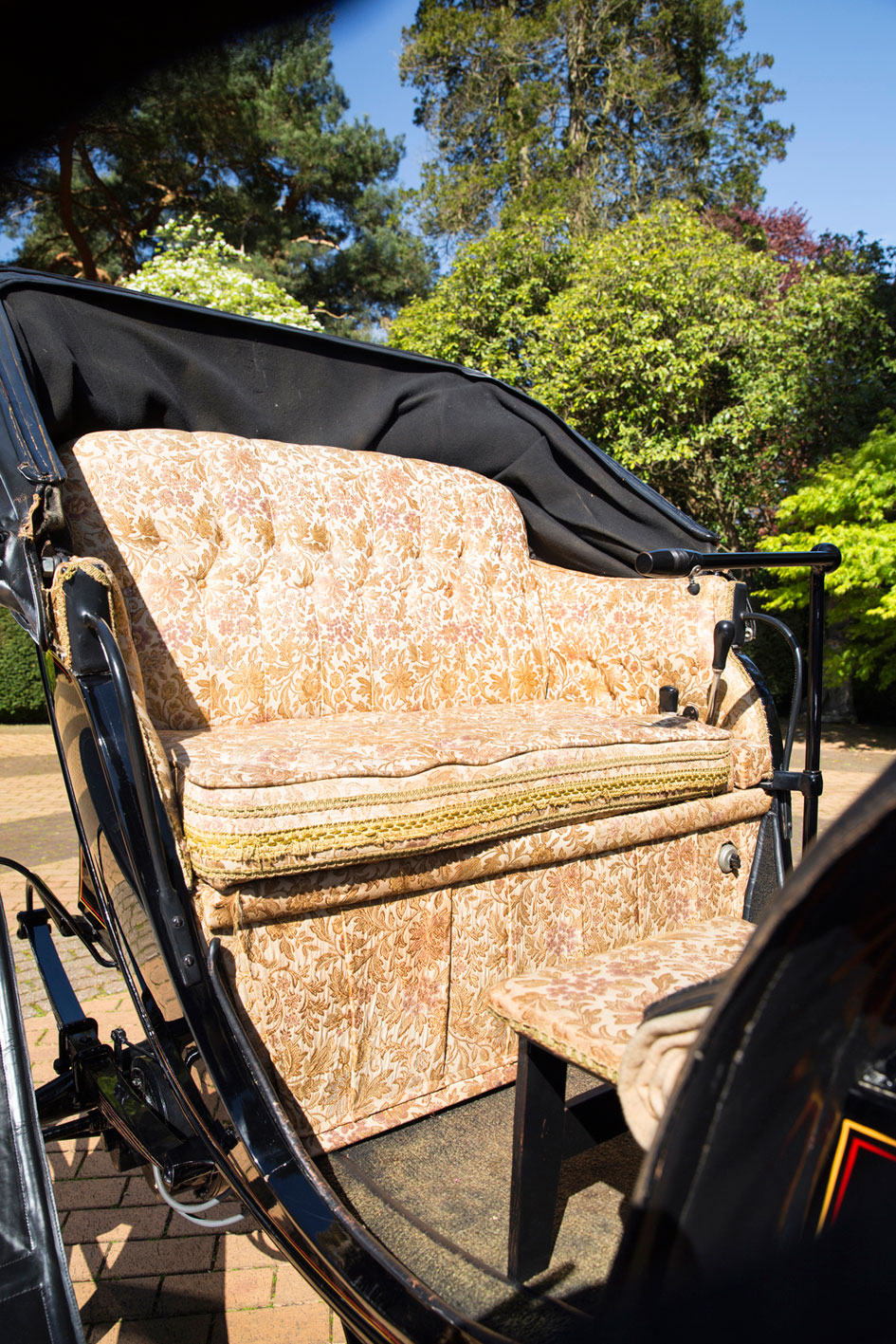 Seating two on the floral print, button-back fabric ‘bench’ seat plus a rear-facing occasional seat, the car is steered by tiller and rudimentary but extremely effective controls to go and stop. With electric coach lamps, it is fully capable of nighttime expeditions but it is in its element with the roof down on a summer’s day.