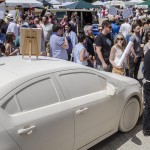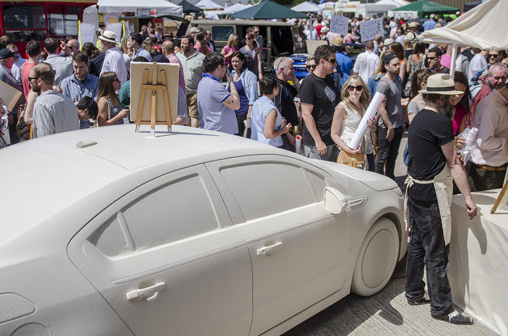 The Vauxhall Art Car Boot Fair features renowned and up and coming artists who personally pitch up to sell their original and limited edition works of art out of the back of new and vintage Vauxhall Motors, at very special prices. Since its inception in 2004, the Fair has commissioned artists to transform a car into a new piece of art work just for the day. Past commissions have included the likes of Sir Peter Blake, Pam Hogg, Oliver Guy Watkins, Natasha Law, Sarah Baker and more. Gavin Turk is the first artist to create a permanent car commission.