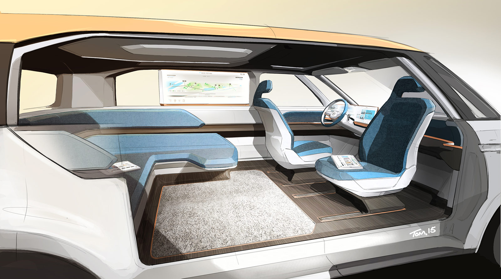 All of BUDD-e’s systems are operated intuitively by gesture control, touchscreen (displays and touch slider) or voice control. The driver can choose between various intuitive control modes (multi-modal interaction). For example, a simple “Hello BUDD-e” activates the vehicle’s voice control. The system also offers completely natural speech interaction. For example, if the driver asks “turn the heat up a bit, please”, the car will respond immediately and appropriately. The system is also able to locate the passenger giving the commands, and react accordingly. If, for instance, someone sitting in the left rear seat says “It’s too hot here”, BUDD-e can immediately lower the temperature in that passenger’s zone.