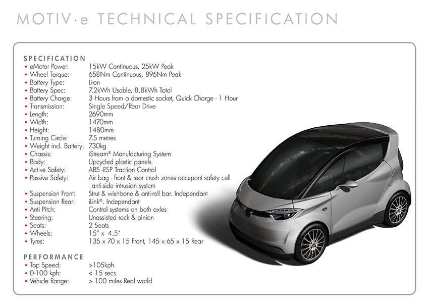 In the current era of urban traffic and environmental problems there is increasing demand for downsizing and fuel efficient cars. MOTIV.e satisfies these demands by utilising ground breaking manufacturing and materials technology while delivering a new level of driver experience which emanates from the Yamaha Motor Company DNA.